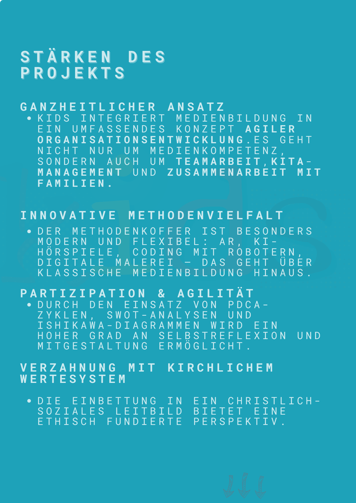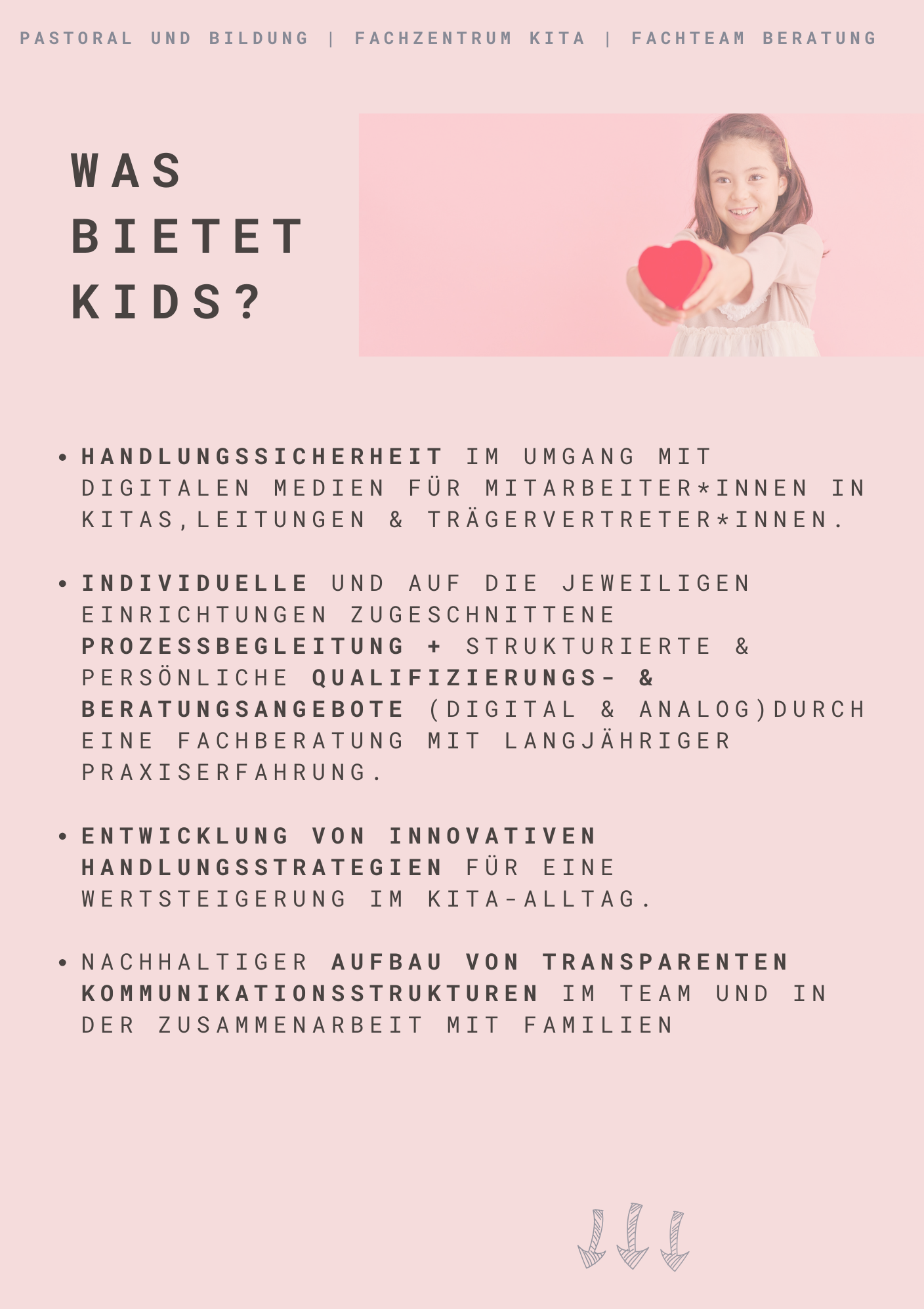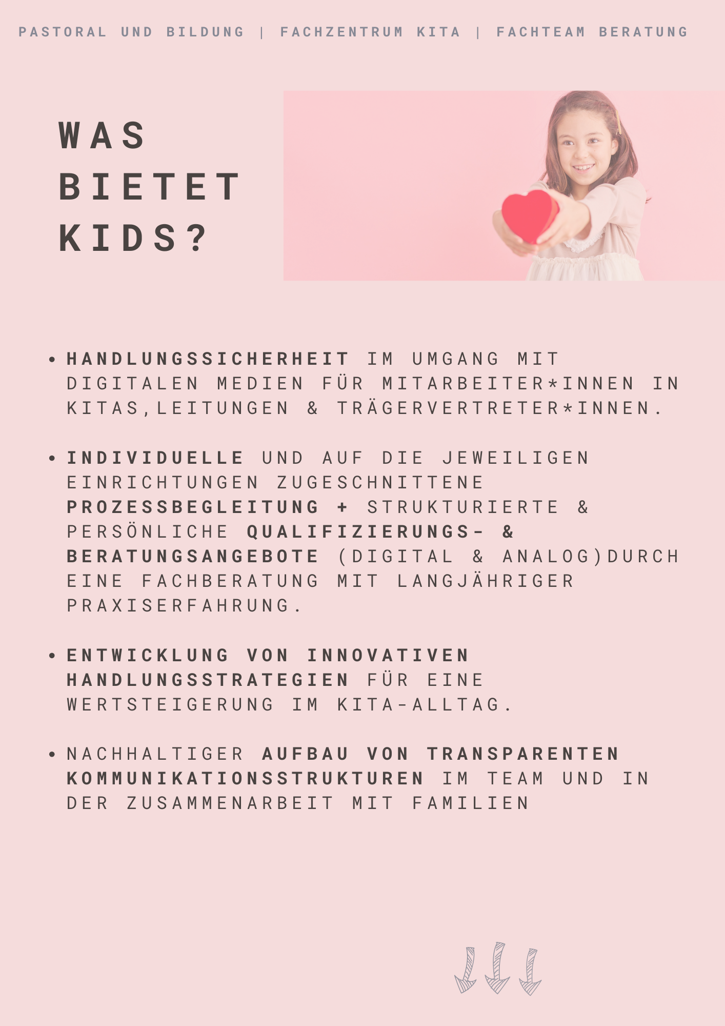Es begleitet Kitas und ihre Träger auf dem Weg in die digitale Zukunft – mit praxisnaher Unterstützung, nachhaltigen Konzepten und einem klaren Fokus auf Qualität und Teilhabe. KIDS verbindet digitale Transformation mit agilen Arbeitsweisen, um die pädagogische Arbeit, die Teamkultur und die organisatorischen Abläufe in Kitas zukunftsfähig weiterzuentwickeln.